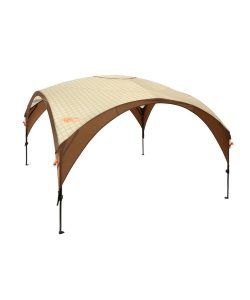 1人でも設営可能な自立式フレームを採用したパーティーシェードは、高さ約2.5m、幅約3mというビッグサイズ。存在感あふれる、第10弾別注コレクションのキーアイテムです。ドームとアーチ形状がミックスされた独特なシルエットが、日陰の面積を大きく確保しながらも開放感をキープ。風をうまく逃がすトップベンチレーション仕様と、お好みの高さを選択可能な3段階調節フレームによって、快適なひとときを過ごすことが出来ます。
