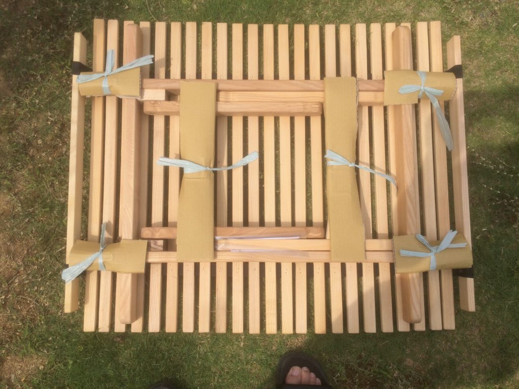 そうそう、商品説明にあるように足を真ん中に入れてテーブルを、