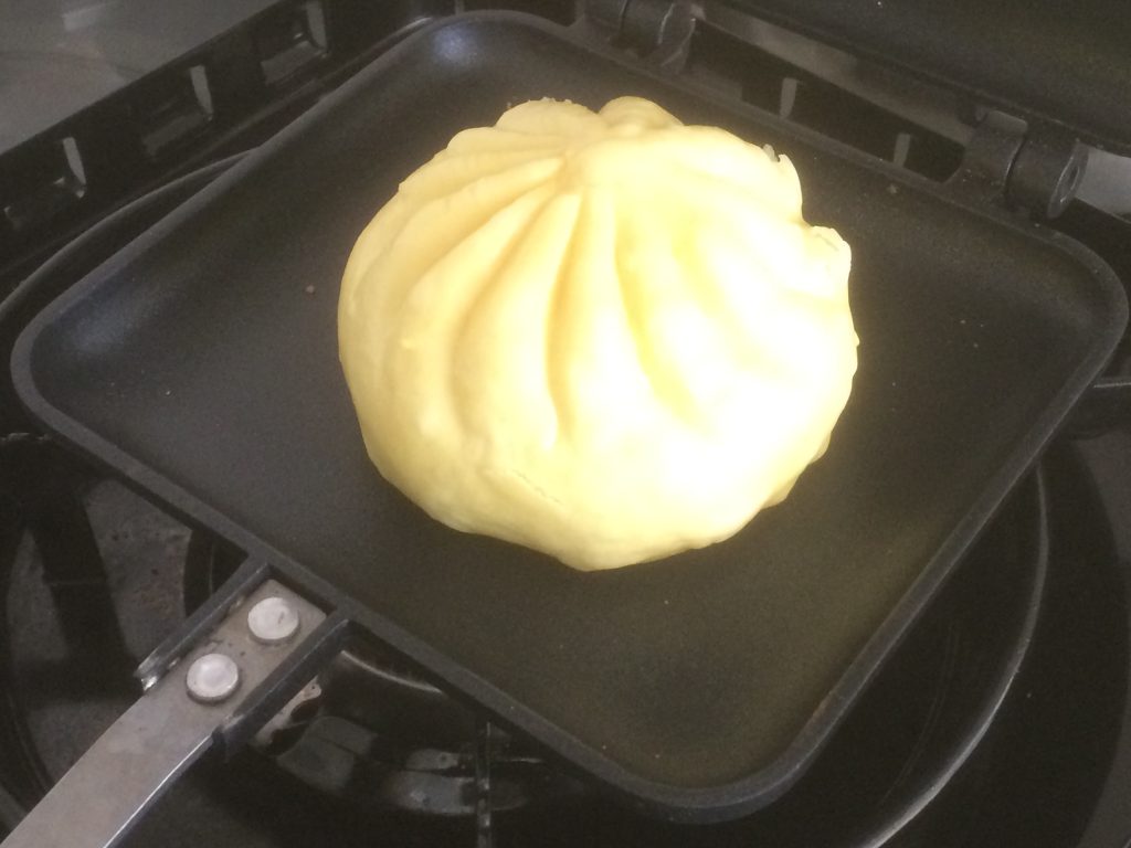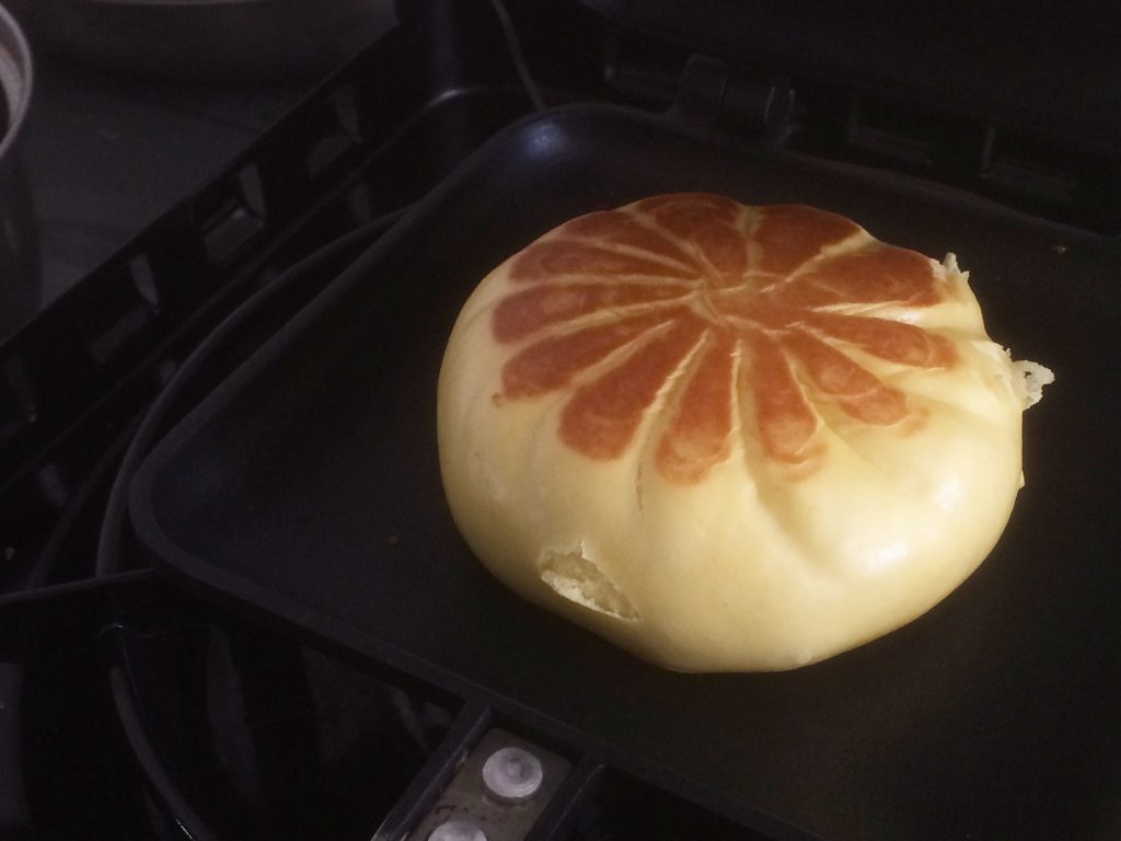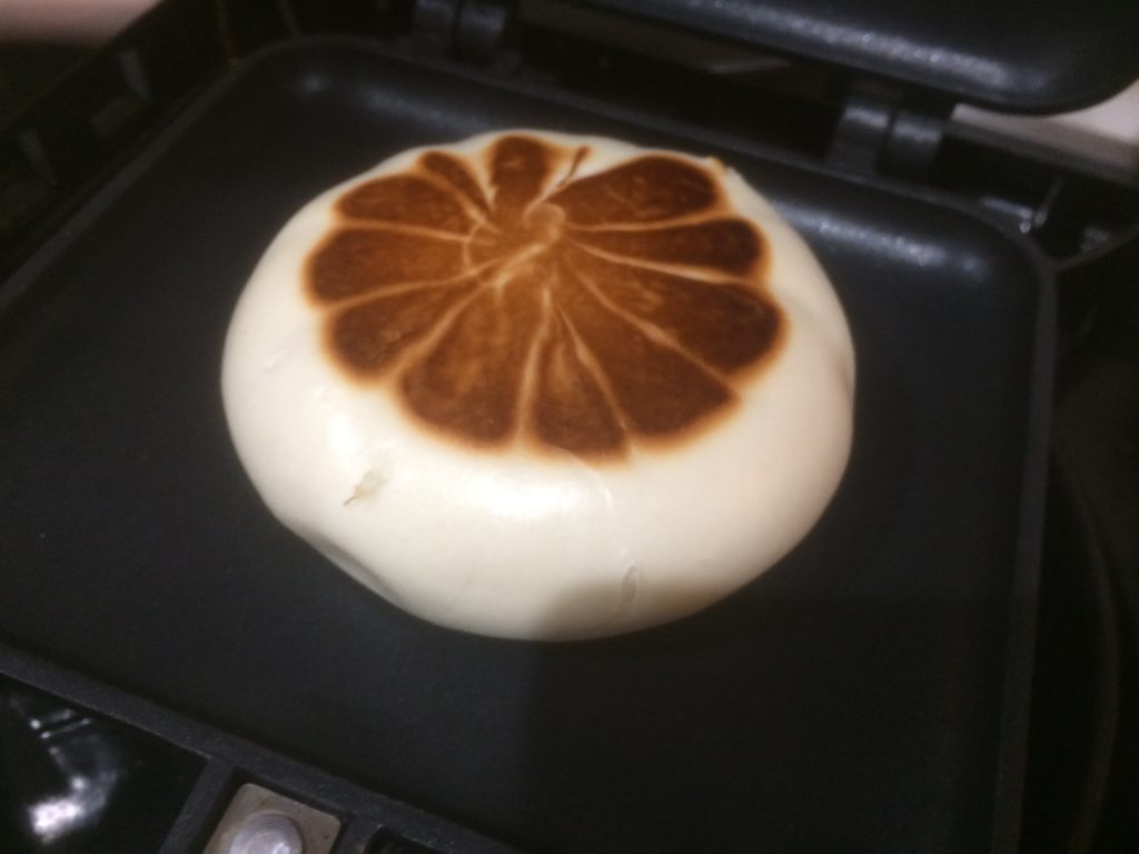 バターを塗ったホットサンドメーカーで肉まんをプレスするだけという簡単な料理なんです。
