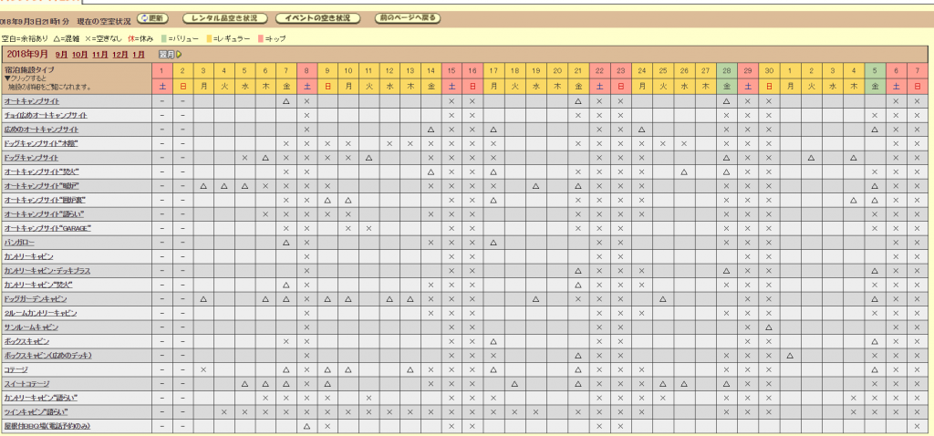 2018キャンプアンドキャビンズ那須9月の予約状況