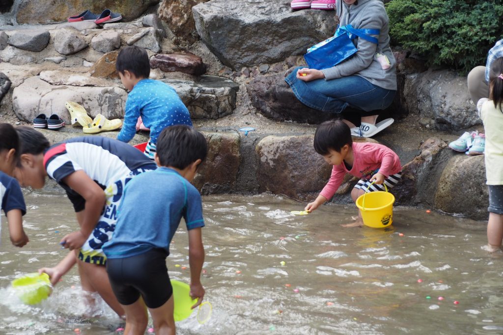 池の縁からすくいます。最後のお片付けタイムは、池に入りますので、濡れてもいい服装をおすすめします。