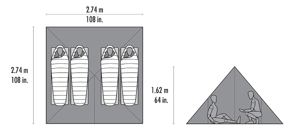 こちらの画像でサイズ感の確認を。大人4名+荷物が余裕をもって収まる。ちなみにポールは付属しない(専用ポールのリリースがない)ので、トレッキングポールなどを活用して設営する必要がある。そんな初心者向けでないところも、MSRらしさだ。