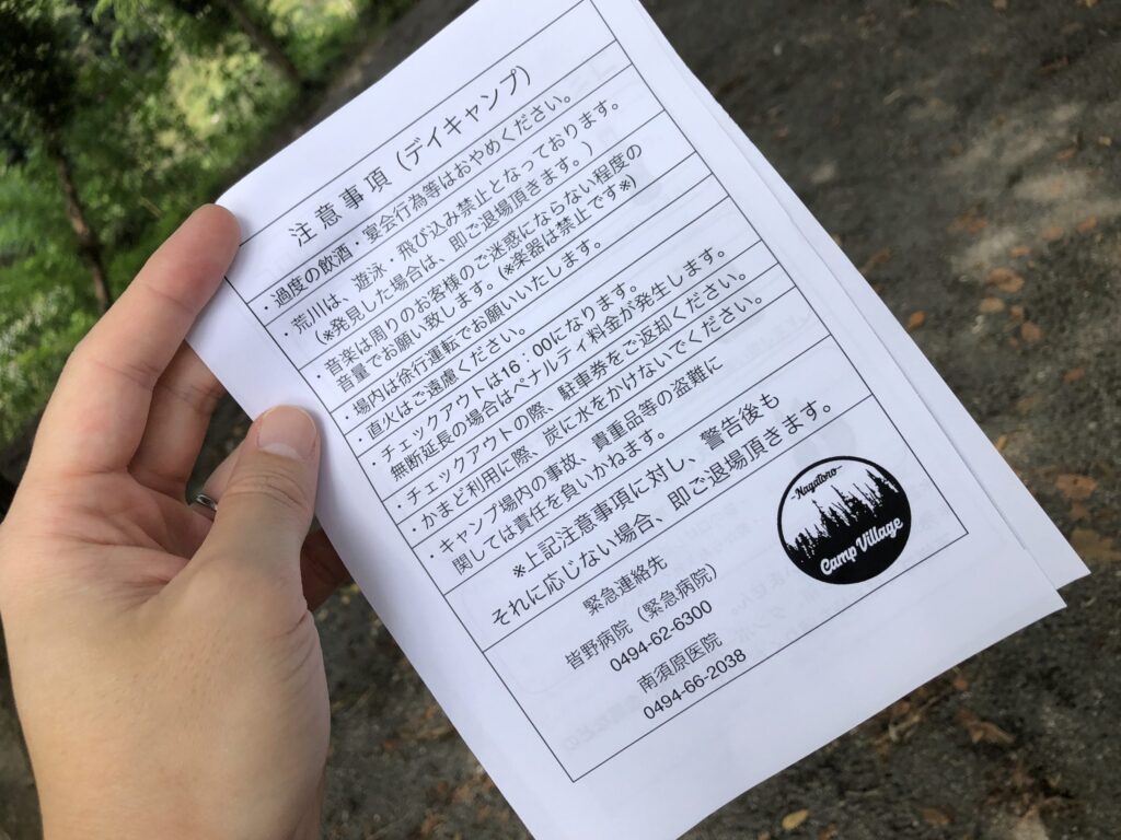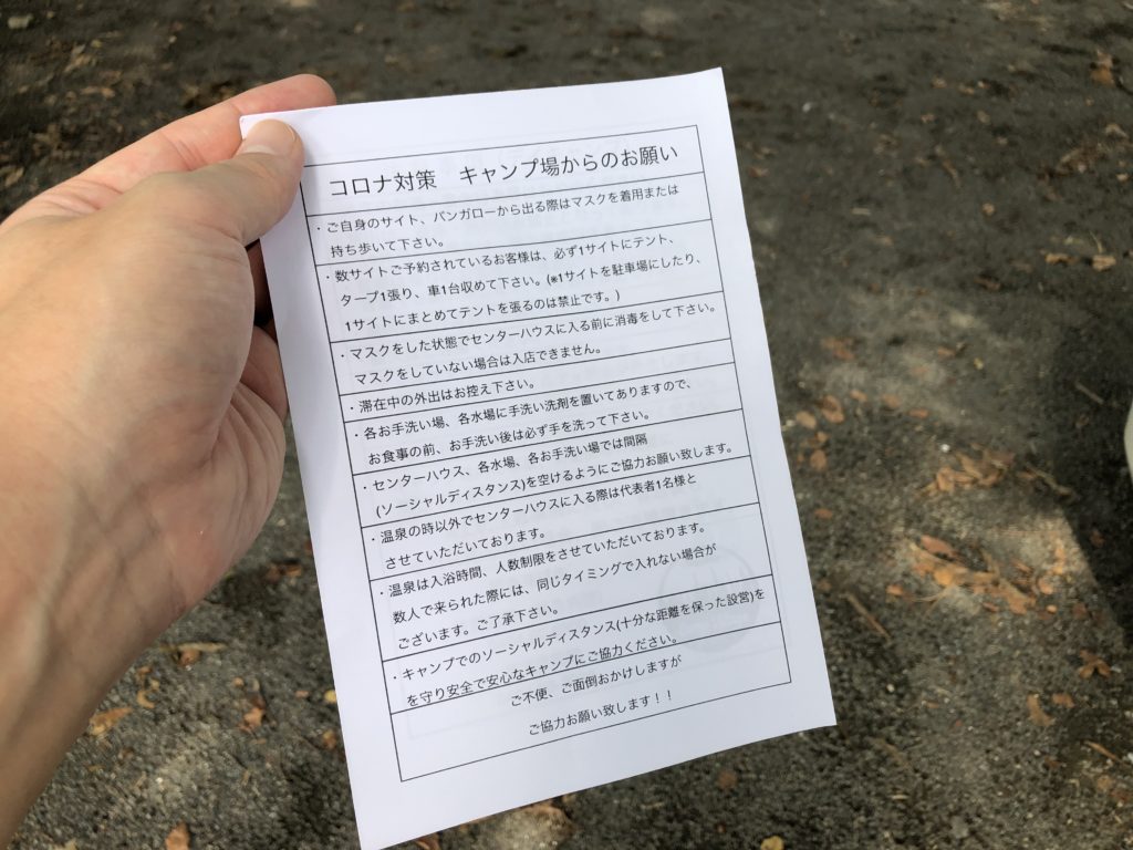 更にキャンプ施設使用上の注意点なども車にのったまま説明を聞きます。