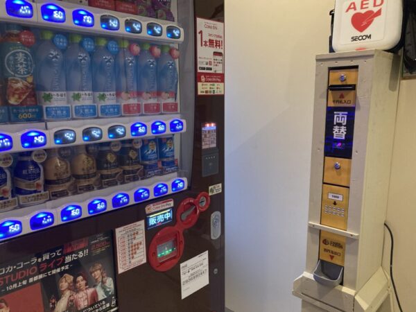 両替機が付いているあたり親切すぎます。更には上にAEDも完備。