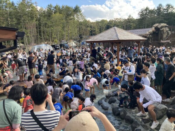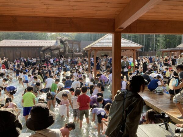 じゃぶじゃぶ池でおこなわれるスーパーぼーる拾いの様子です。