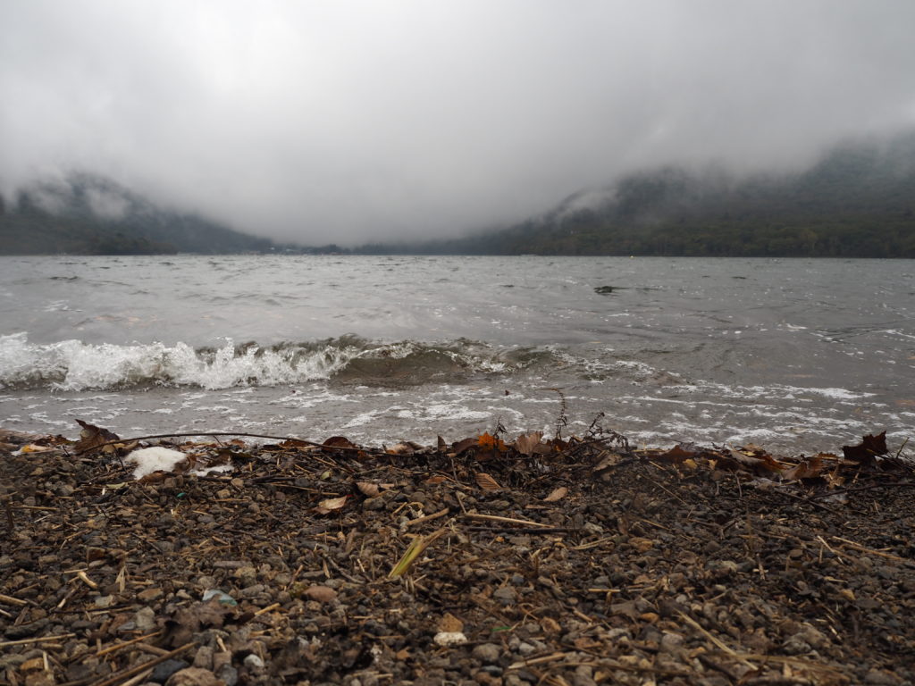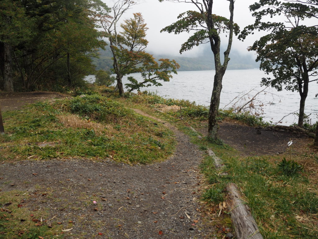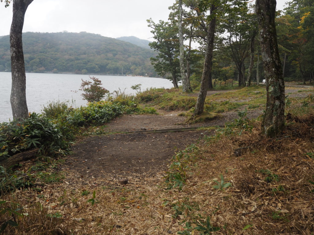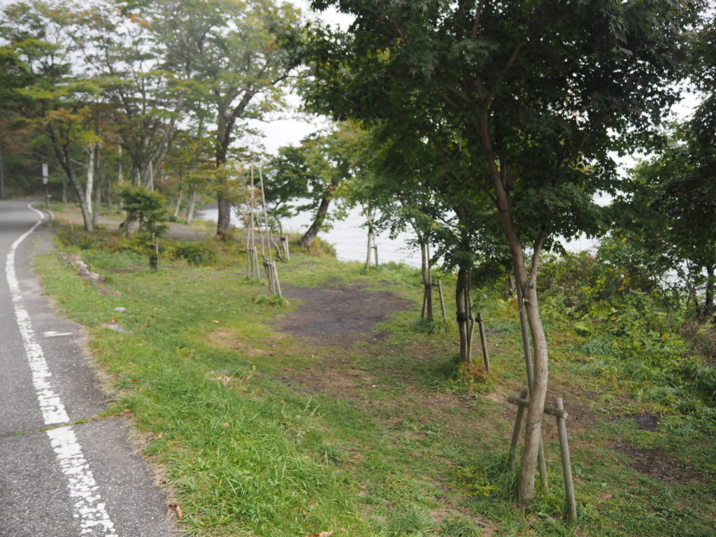 駐車場から道路を渡って湖の方に行くと比較的平らな芝生サイトがありました。