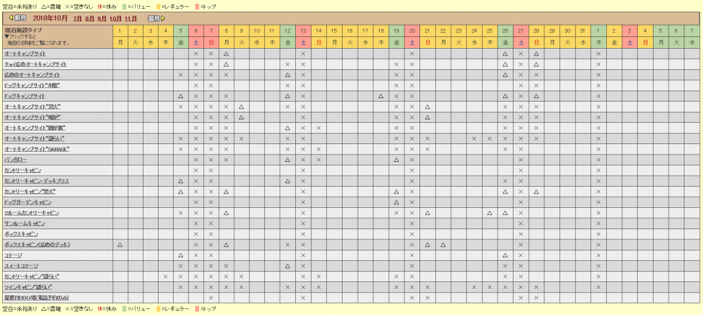 キャンプアンドキャビンズ那須の10月ハロウィーン予約状況一覧
