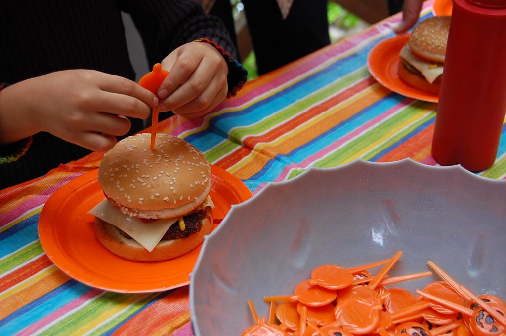 お肉をこねて、ジュージュー焼いて、チーズ・トマト・ピクルスをトッピング!自分で作った焼き立てバーガーは、とってもジューシー!