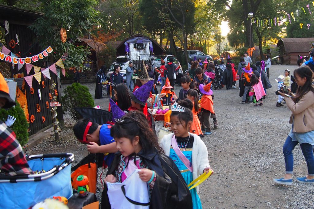「いたずらするぞ!お菓子をちょうだい!」仮装したこどもたちが、みなさんのテントやキャビンを回ってお菓子をねだります。