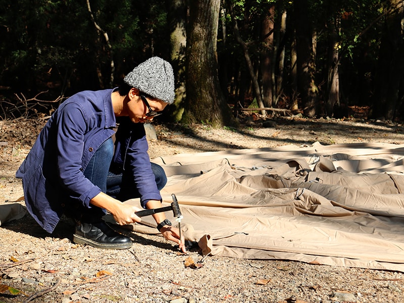 アウターテントの各辺が引っ張られた状態になるようにし、付属のペグで計8カ所を固定します。