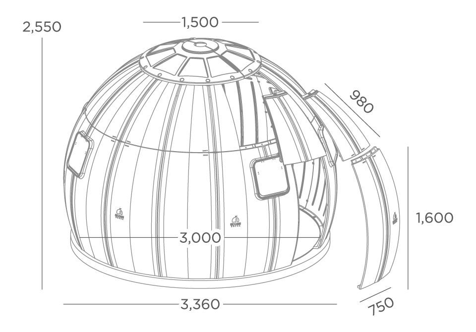大きさ 外寸 : 最大外径3,360 × 全高2,550 床厚60(mm)