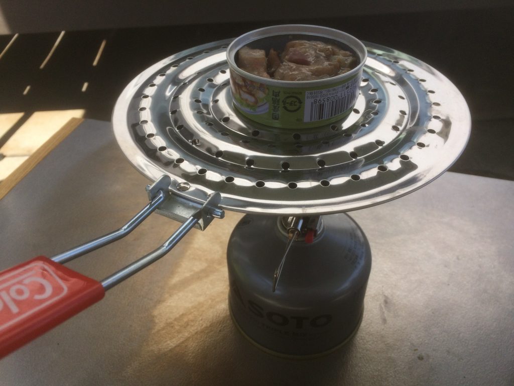 缶詰をバーナー&焚き火用ホットプレートの上にのせます。