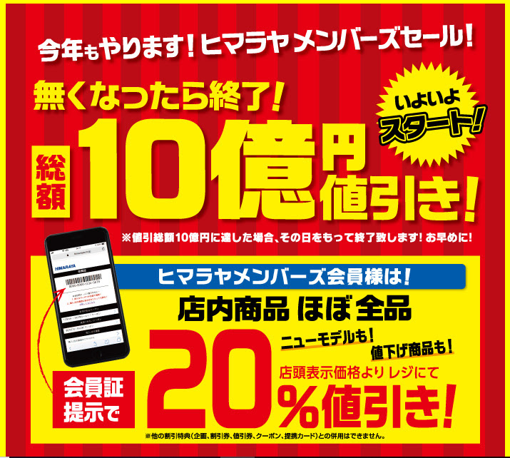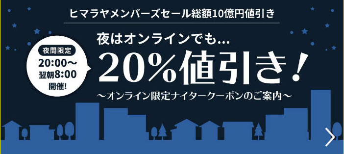 昨年近くにヒマラヤ店舗が無く涙をのんだ方もいらっしゃったと思いますが、今年はオンラインでも20%OFFを導入しています。非常にありがたいです!