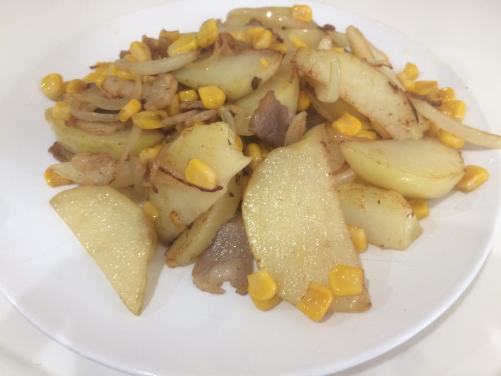 ポテトをレンジでチンしてその間にベーコン、たまねぎ、コーンをオリーブオイルで炒めて最後にチンしたポテトをINして塩コショウするだけ~