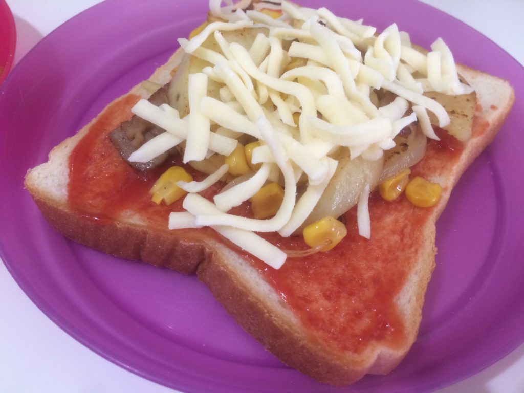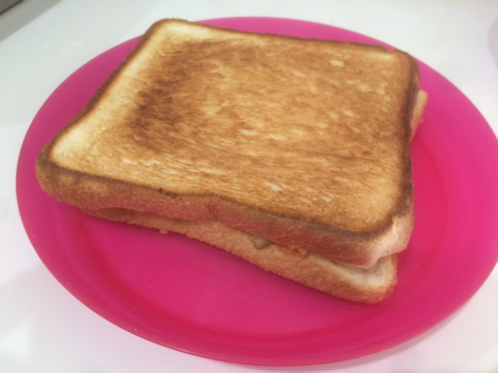 3、2をパンに乗せて、その上にチーズをのせてホットサンドで焼く(弱火)