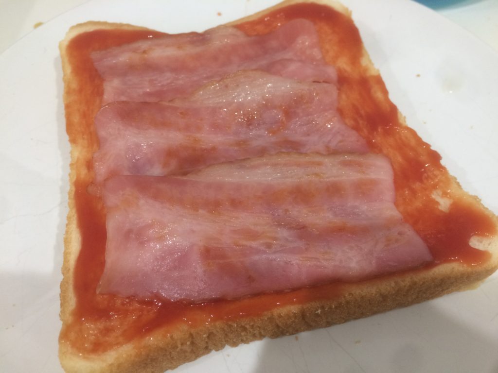 焼いたらケチャップを塗ったパンの上にベーコンをのせま~す