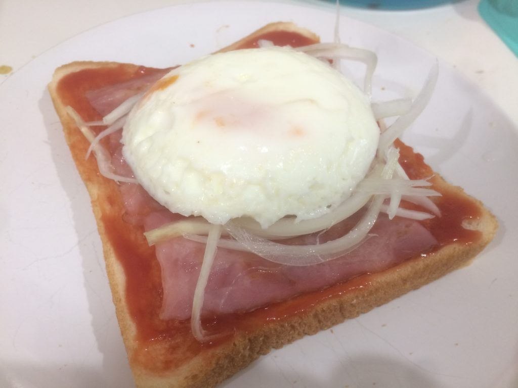 ベーコンの上にスライスしたたまねぎとレンジでチンした卵を上にのせま~す