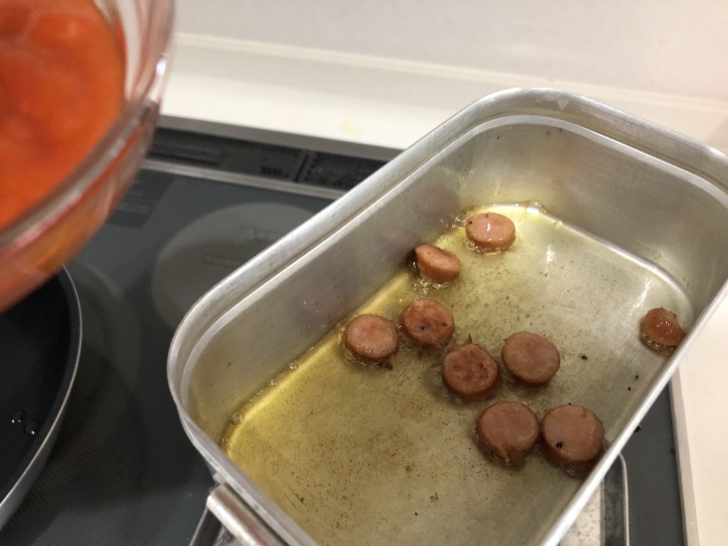 3. 弱火でじっくりとウインナーを炒めます。