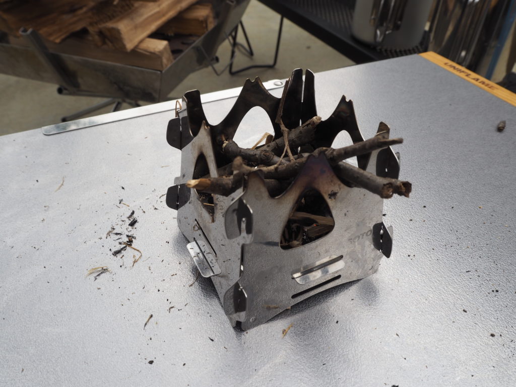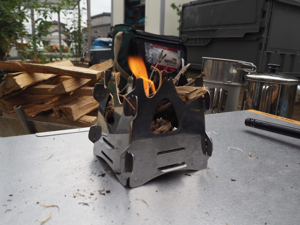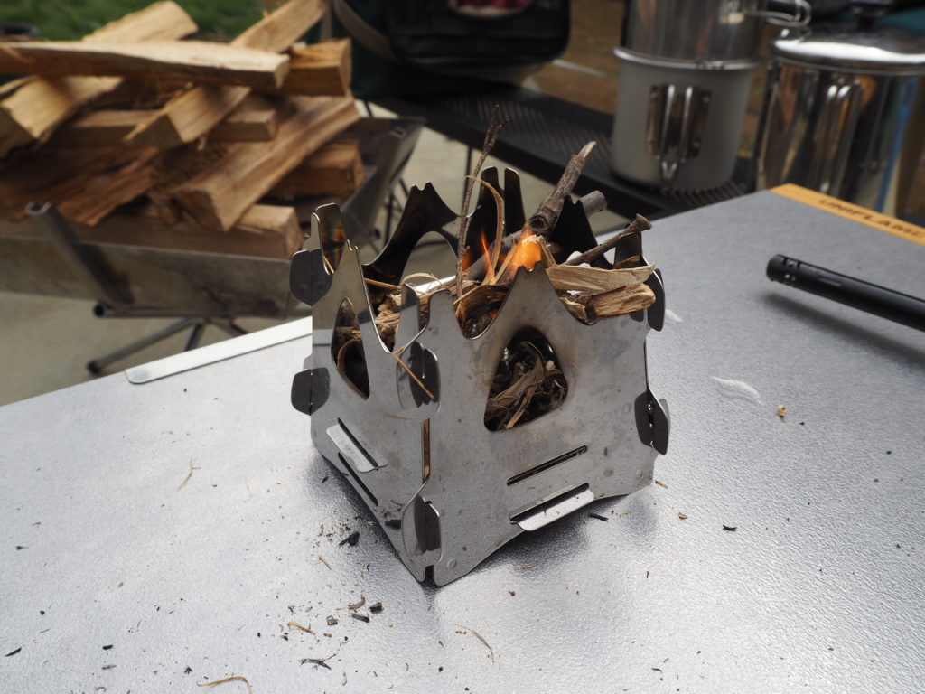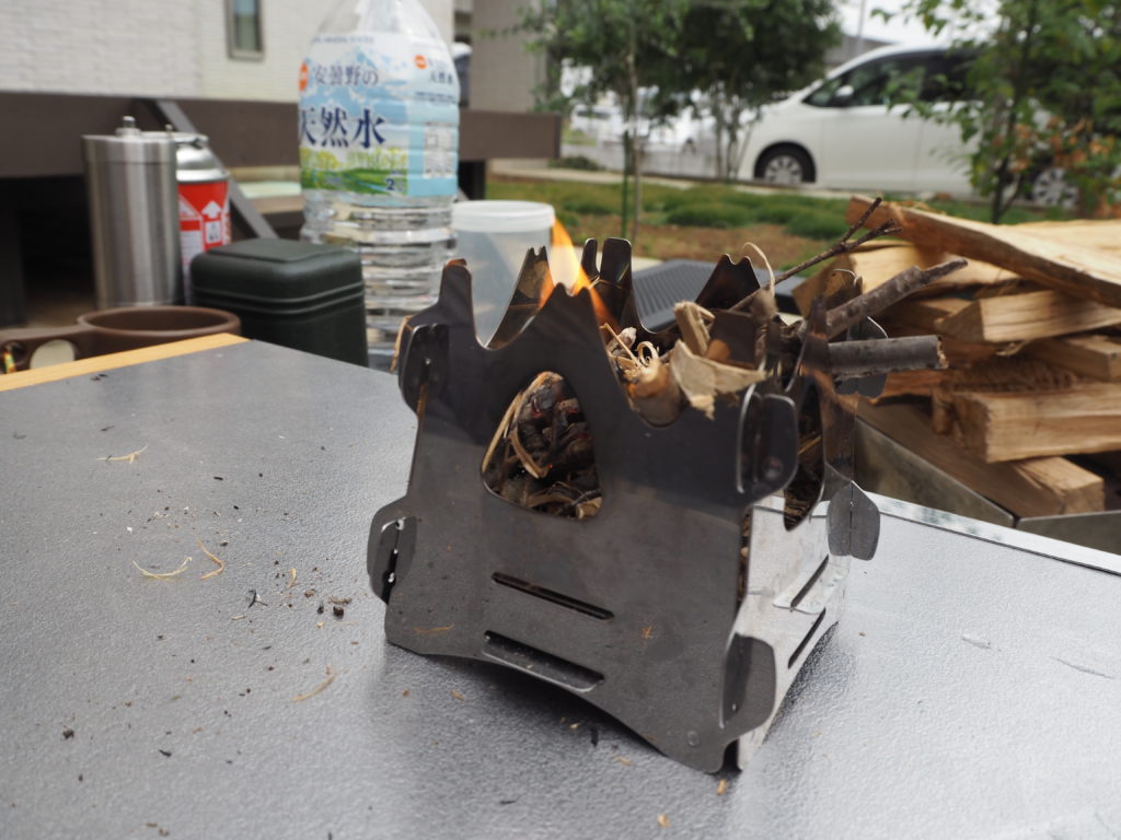 fam2015年秋号の付録に付いていたたき火台で薪と小枝をつかってたき火しました。