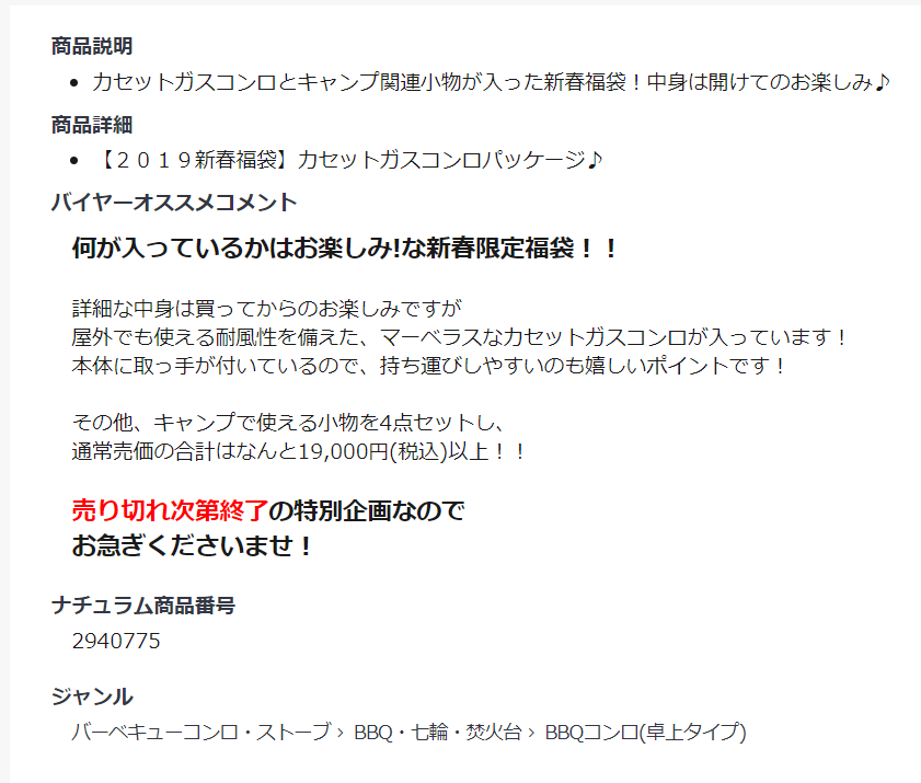 2019ナチュラム福袋の中身【キャンプ】