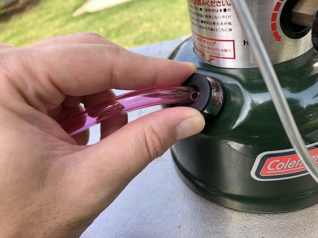 特に難しいことは無く、ガソリンランタンにホースを突っ込んで反対側をガソリン缶に。
