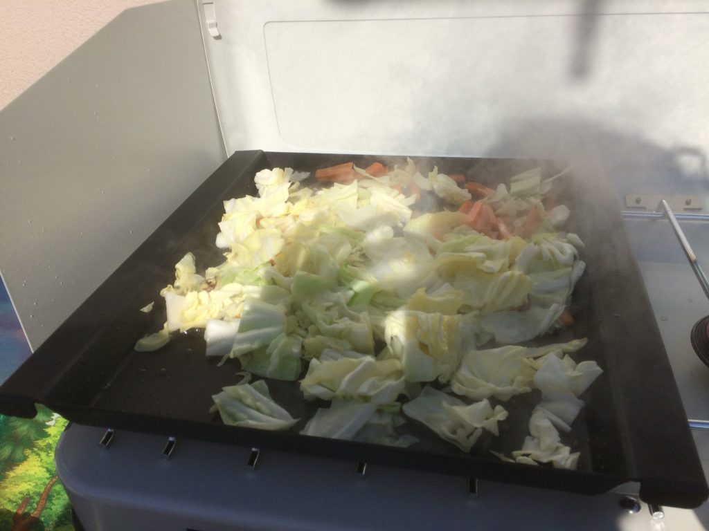 熱したユニフレームの鉄板に油を引いてキャベツとニンジンをのせまーす