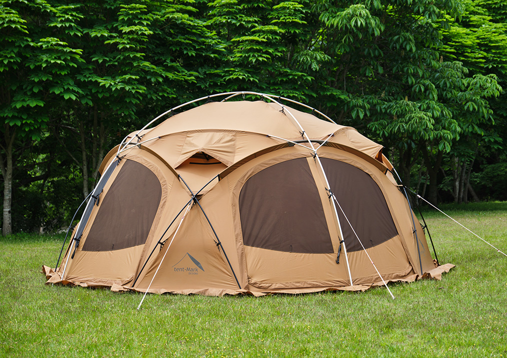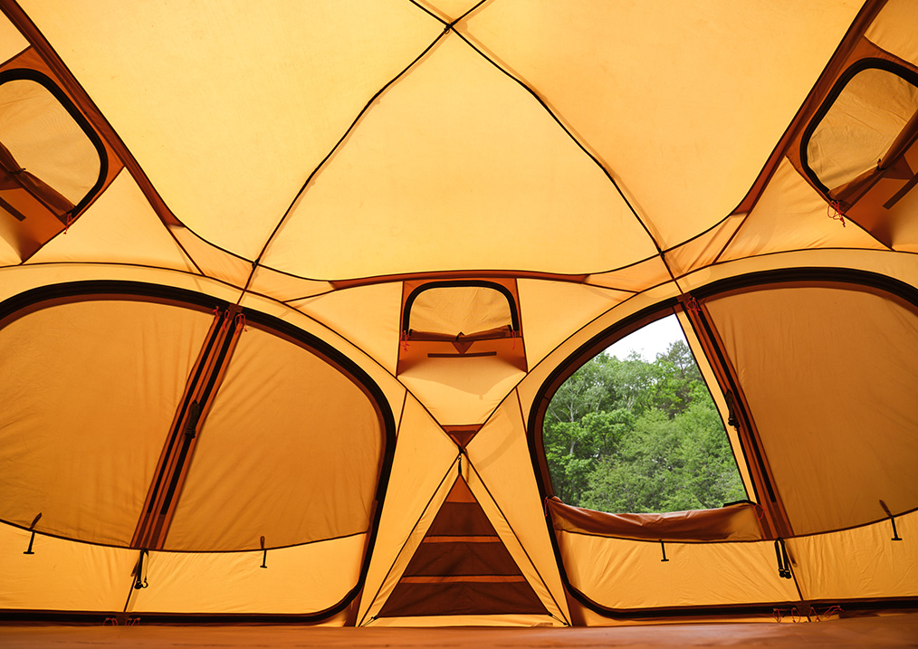 山岳ベースキャンプにも使用可能な耐風性を備え通気性抜群で快適な居住空間のドーム型シェルター。