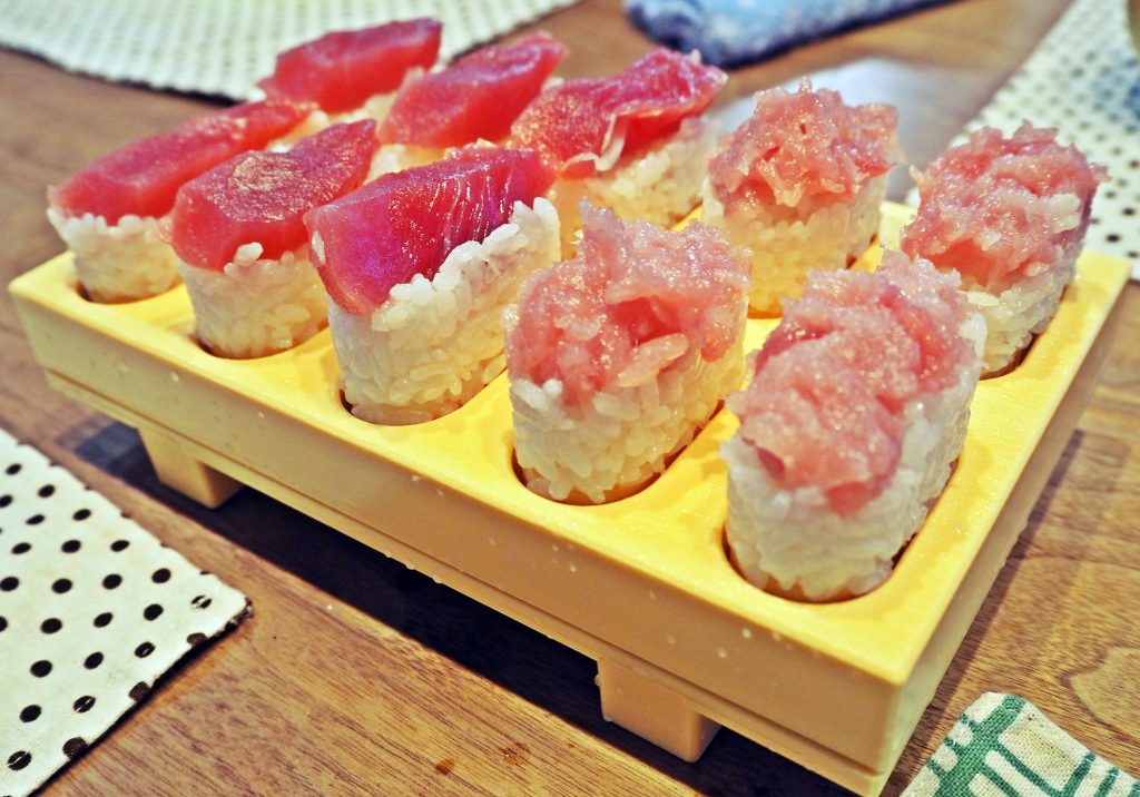 ・ぎゅっとしてネタをのせるだけで握りすしが10貫作れます。