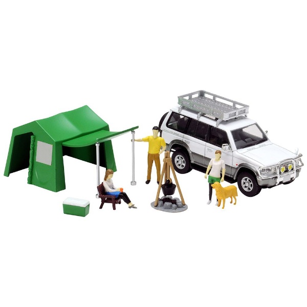 ●様々に撮影してSNSでシェアしよう!キャンプをテーマにしたセット。たき火を囲んだり、犬と遊んだり。男女3体、および犬のフィギュアが付属します。三菱パジェロはルーフキャリア、グリルガードなどオプションパーツ装着仕様です。